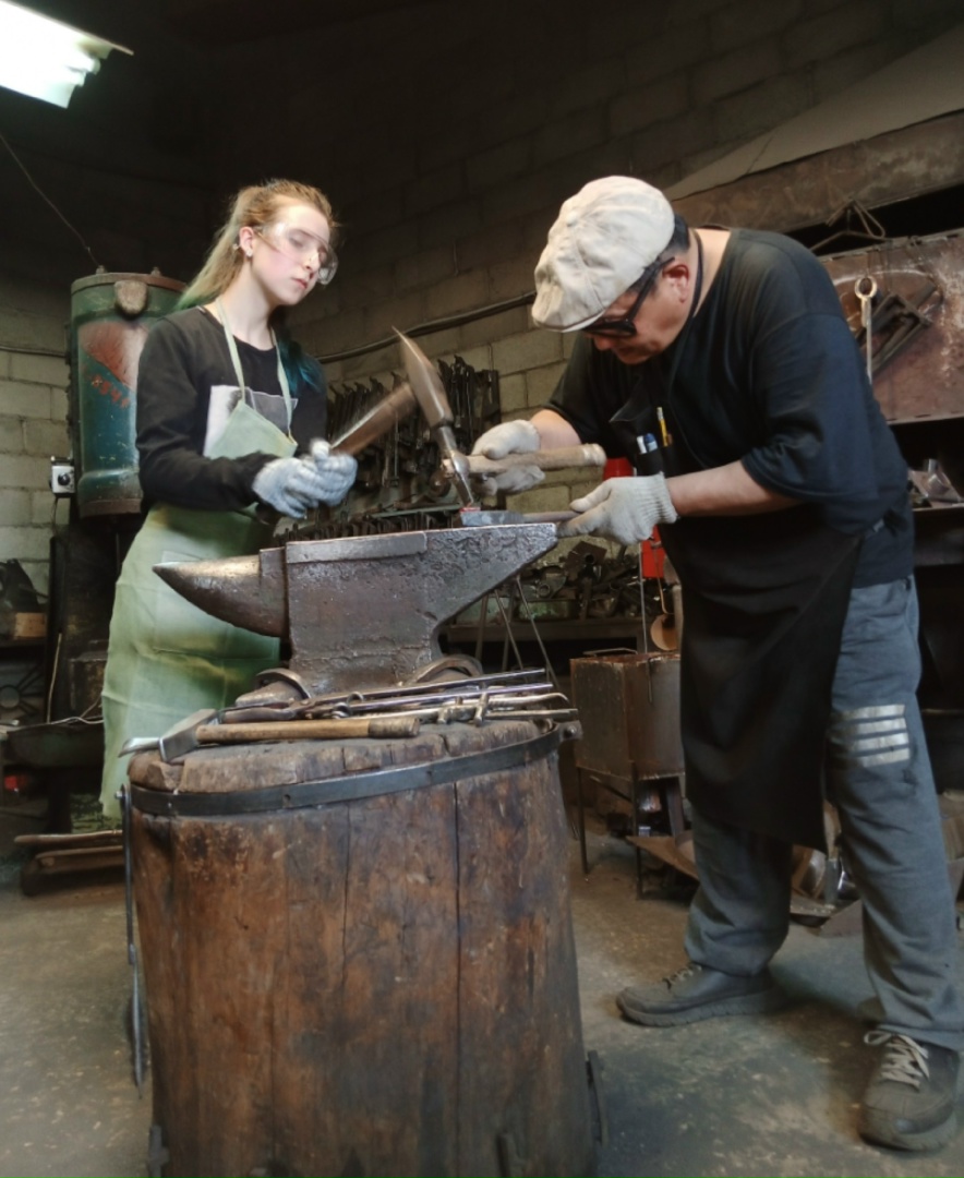 Девушки сами ковали гвоздь под руководством опытного кузнеца Бориса.